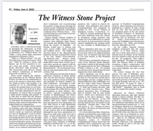 “Inspired by the Stolpersteine project in Germany (and with their blessing), we bear witness by installing a marker which recalls an enslaved individual at a site of significance, such as where they lived, worked, or prayed. We cannot change the past, but we can, through this project, give a voice to the voiceless by uncovering their stories. We partner with local schools and historical societies to assist students in researching the history of an enslaved individual from their community and reconstructing the memory of that person through the written record. Ultimately the students, along with the community, will install a commemorative Witness Stone.” (witnessstonesproject.org/what-is-the-witness-stones-project/).