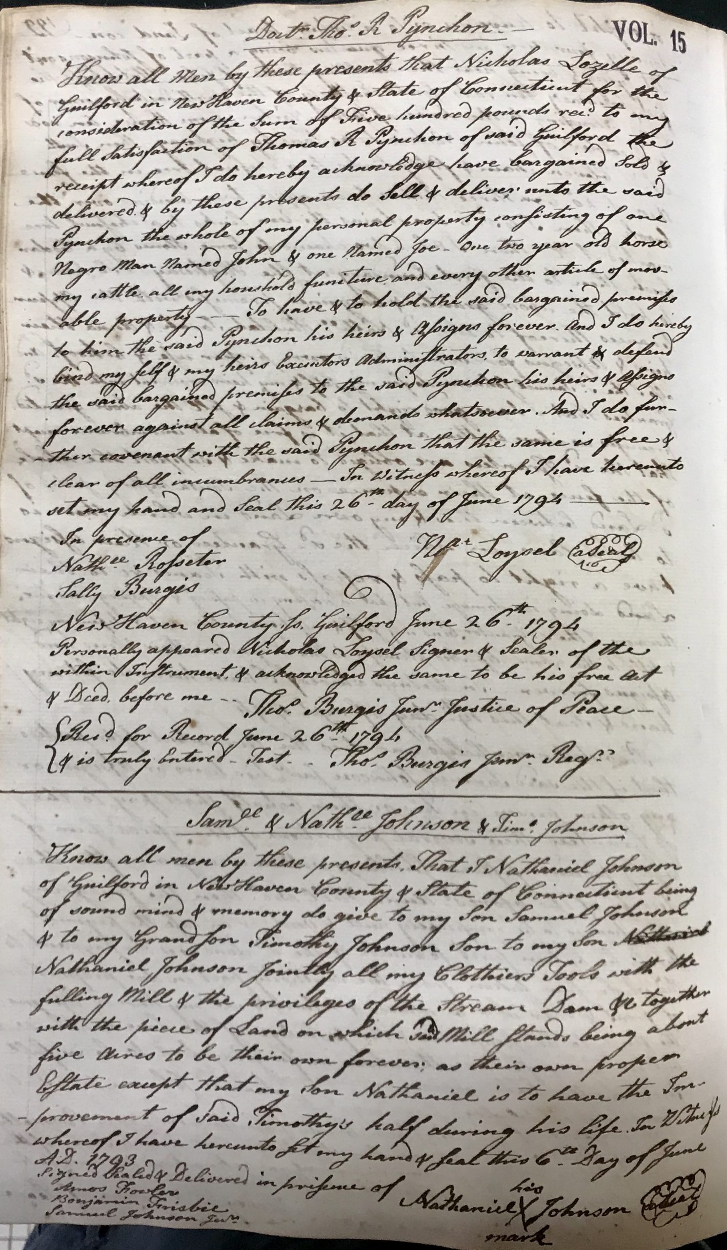 Know all Men by these presents that Nicholas Lozelle of Guilford in New Haven County & State of Connecticut for the consideration of the Sum of Five hundred pounds ??? to my full satisfaction of Thomas A. Pynchon of said Guilford the receipt whereof I do hereby acknowledge I have bargained sold & Delivered and by these presents do Sell & deliver unto the said Pynchon the whole of my personal property consisting of one Negro Man Named John & one Named Joe, one two years old horse, my cattle all my household furniture and every other article of moveable property_______ To have & to hold the said bargained premises to him the said Pynchon his heirs & Assigns forever and I do hereby bind my self & my heirs Executors Administrators to warrant and defend the said bargained premises to the said Pynchon his heirs & Assigns forever against all claims & demands whatsoever. And I do sign further covenant with the said Pynchon that the same is free & clear of all incumbrances_______ In Witness thereof I have hereunto set my Hand and Seal this 26th day of June 1794.