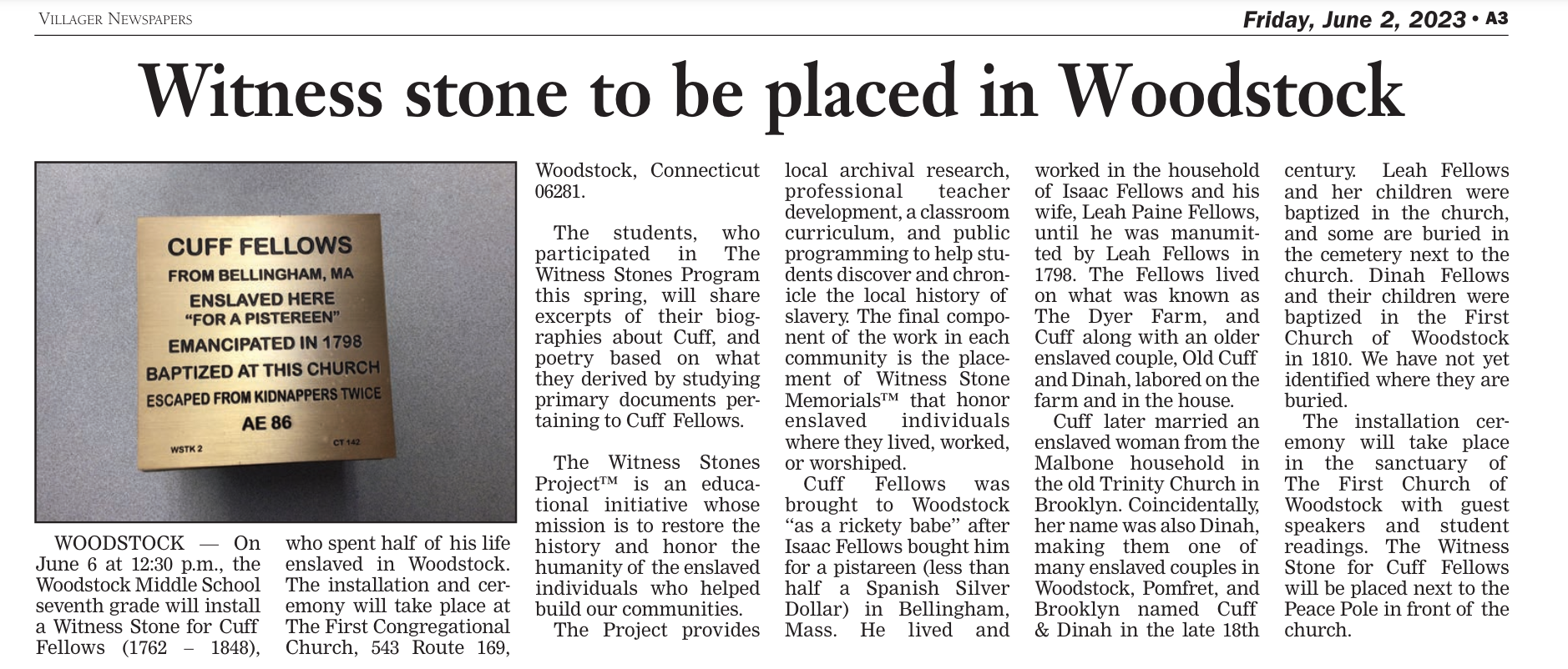 I read two stories of interest in a recent issue of The Woodstock Villager, a local newspaper from my grandfather’s Connecticut hometown. The first story (on page A3) concerned a Witness Stone for Cuff Fellows (1762-1848), who spent half of his life enslaved in Woodstock. The marker was placed at the First Congregational Church (where my grandfather was baptized, where he married his wife, and where both were buried in the nearby cemetery along with several generations of my ancestors, and, maybe someday, myself). The article notes that Cuff Fellows was enslaved by Isaac Fellows and emancipated in 1798 by Isaac’s widow Leah (Paine) Fellows. Leah was the daughter of Daniel and Leah (Paine) Smith of Woodstock, the great-great-grandparents of my great-great-granduncle (by marriage) Lt. John Merrick Paine (1845-1916), who had served in the 29th Connecticut Colored Infantry Regiment during the Civil War. Continue reading.